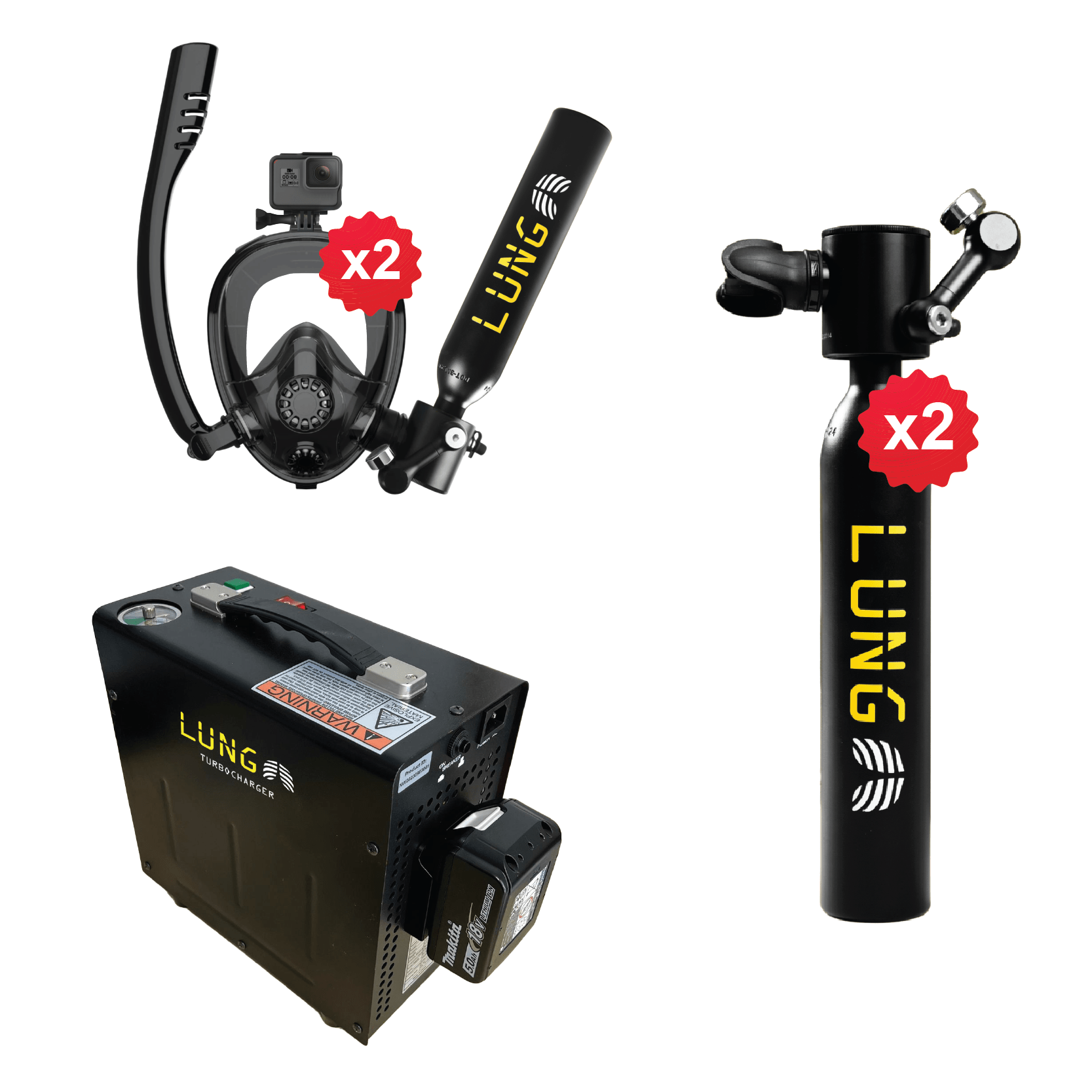 The Lung Turbocharger is a battery powered refill station for your Lung T-500™. It completely refills anywhere in minutes, hassle-free. Simply power the Lung Turbocharger via a 18V power tool battery or plug directly into a 110V / 220V mains power socket. The Lung Turbocharger is compatible with Makita, Milwaukee, Bosch & DeWalt rechargeable 18V DC Lithium-Ion batteries. Take the Lung Turbocharger with you everywhere thanks to its compact and lightweight design. It also comes with a high-pressure cable, auto-stop function, and spare filters.